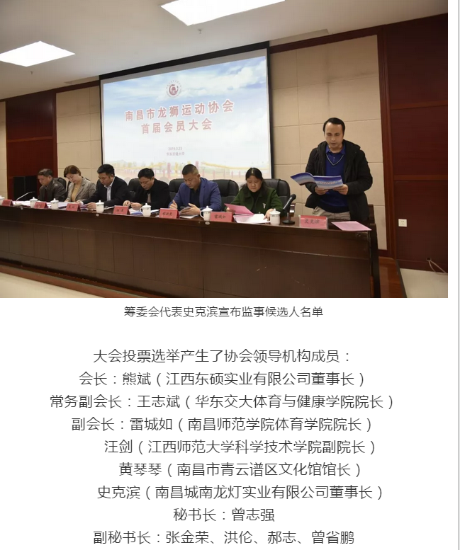 2019年3月23日,南昌市龙狮运动协会首届会员大会在海角 举行,南昌市体育总会秘书长伍革,南昌市民政局程洪亮主任出席了会议,海角 院长王志斌主持会议。