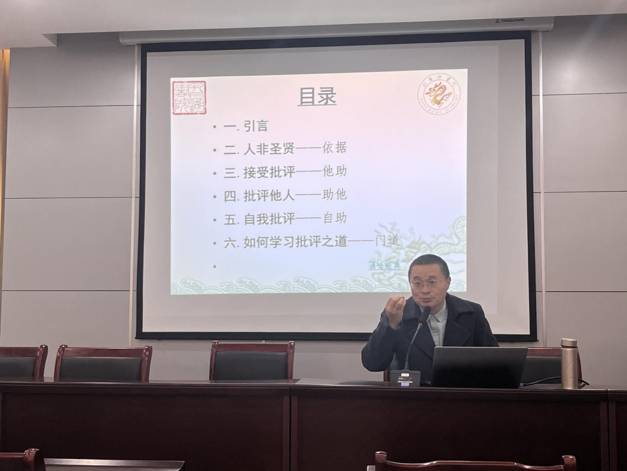 图书馆馆长石初军为学员们带来了第一讲——《批评与自我批评》。石老师带领学员深入探讨批评的力量以及如何在批评中实现自我提升。石老师首先回顾了党的七大,毛泽东在《论联合政府》中提出的“批评和自我批评”作为党的三大优良作风之一,早在1945年4月就已成为党章的一部分; 为我们解读了人之性、人之命、人之志、人之义的不同层面,从善与恶的较量,以及改过迁善的必由之路去理解人一字。最后石老师强调了接受批评的重要性。要学会欣然接受批评,将其视为一种贵人相助的机会。通过肯定的心态去理解批评者,做到“闻过则喜”,这样我们才能得到“贵人”的指点,不断完善自我。