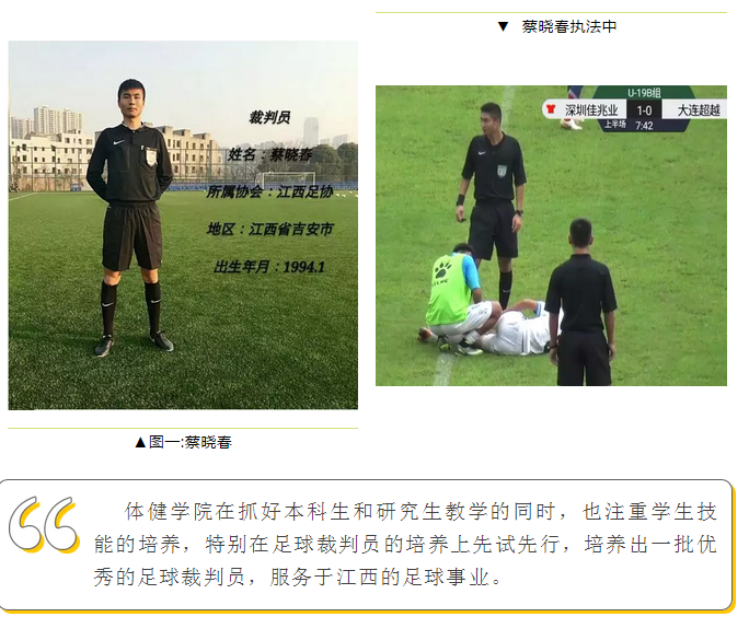 足球裁判员遍布全省各地,部分优秀的裁判员已经活跃在中国足球职业联赛的赛场上,15级体育研究生(原体院11级体教学生)杨磊同学执法中国足球协会乙级联赛;99级体教学生陈国华、00级体教学生李旻、谢俊、李峰担任江西省足协裁判长工作。海角
